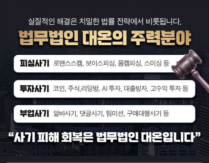 법무법인 대온 핀테크센터는 투자사기, 리딩방 사칭, 거래소 사칭, 가상자산 관련 피해 사건에서 가압류와 지갑동결, 민사 손해배상 중심의 대응 전략을 검토합니다.
